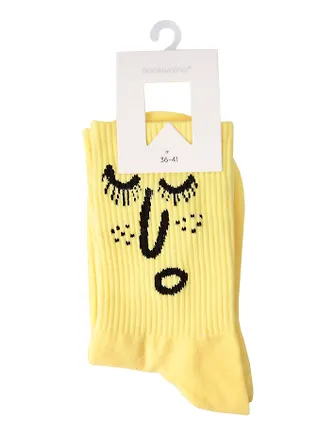 Тонкие носки в приятной желтой расцветке и с симпатичными мордашками. Мой размер обуви 37, поэтому мне носки конечно по размеру подошли, но оказались очень высокие, буквально как гольфы. Состав у носков не плохой, в принципе не сплошная синтетика, это радует. Надела пока носки только олин раз, вроде удобный. Надеюсь, что после стирки носки не растянутся и цвет не полиняет.