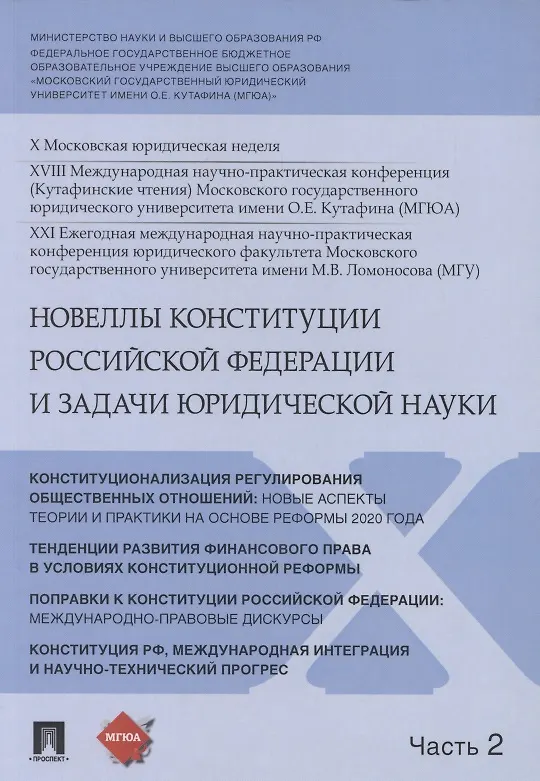 24-27 ноября 2020 г. в рамках X Московской юридической недели состоялись совместные XVIII Международная научно-практическая конференция (Кутафинские чтения) Московского государственного юридического университета имени О. Е. Кутафина (МГЮА) и XXI Международная научно-практическая конференция юридического факультета Московского государственного университета имени М. В. Ломоносова на тему «Новеллы Конституции Российской Федерации и задачи юридической науки». В сборник включены тезисы докладов, подготовленные для заседаний конференций, круглых столов и дискуссионных площадок, проводившихся в рамках конференции.