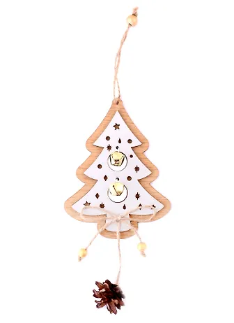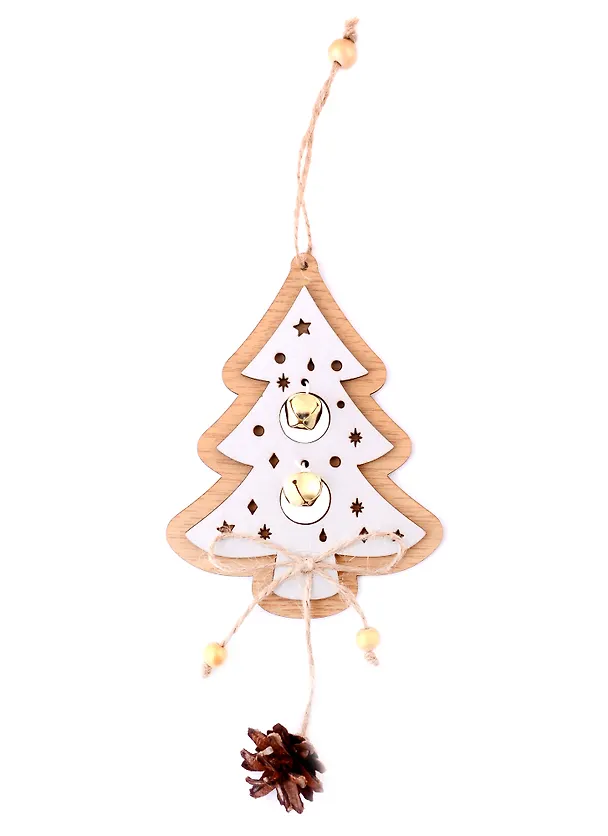 Красивое новогодее украшение в виде елочки. Выполнено из дерева. Елочка окрашена в серебряный цвет и дополнена бубенчиками. Среднего размера. Есть отверстие под подвес и веревочка в комплекте. Легкая и прочная. Дополнительно украшена настоящей шишкой на веревочке. Заказывала в интернет-магазине. Быстро доставили и отлично упаковали в защитную пупырчатую пленку.