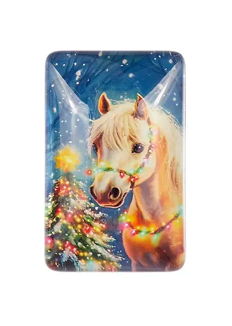 Хороший магнит с ёлочкой и коняшкой – символом года, мне понравился. Из всех магнитов этой серии только от него нет ощущения ненатуральности и ИИшности, хотя я не исключаю, что рисунок тоже создавался именно так. Но он хотя бы выглядит симпатично, а то, насколько он объёмный и блестящий, особенно привлекло. Приятные, мягкие, таинственные цвета и стеклянный блеск, плавные очертания. Правда, смотрится хорошо.