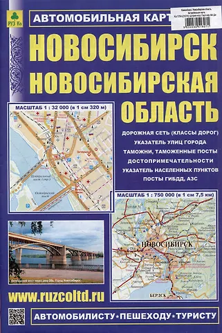 Новосибирск. Новосибирская область. Автомобильная карта. Масштаб (1:32000) (1:750000). Дорожная сеть (классы дорог), указатель улиц города, таможни, таможенные посты, достопримечательности, указатель населенных пунктов, посты ГИБДД, АЗС.