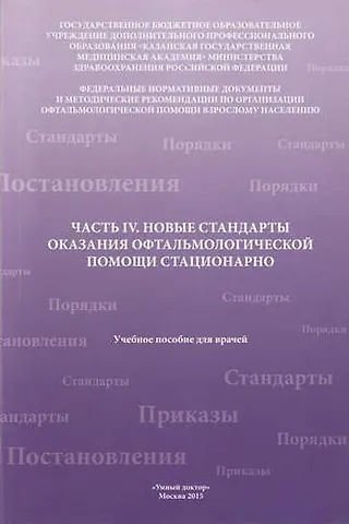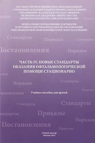 В учебном пособии представлены действующие стандарты (2013 г.) оказания офтальмологической стационарной помощи взрослому населению. Издание предназначено для системы послевузовского профессионального образования врачей-офтальмологов.