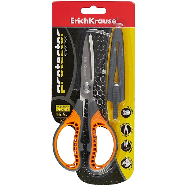 Прекрасные ножницы хоть для офиса, хоть для рукоделия. Качественно изготовлены. Из нержавеющей стали. В комплекте к ножницам имеется чехол из твердого пластика для безопасного хранения. Этот чехол подходит и для других подобных ножниц, например для "Protector Lock", "Megapolis", "Megapolis Ergo" . Сидит чехол крепко. Длина данных ножниц в чехле 17,5 см.