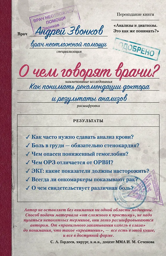 Врач скорой помощи Андрей Звонков собрал доступные рекомендации, благодаря которым каждый сможет без труда разобраться в собственных анализах, диагнозах и непонятных медицинских терминах.