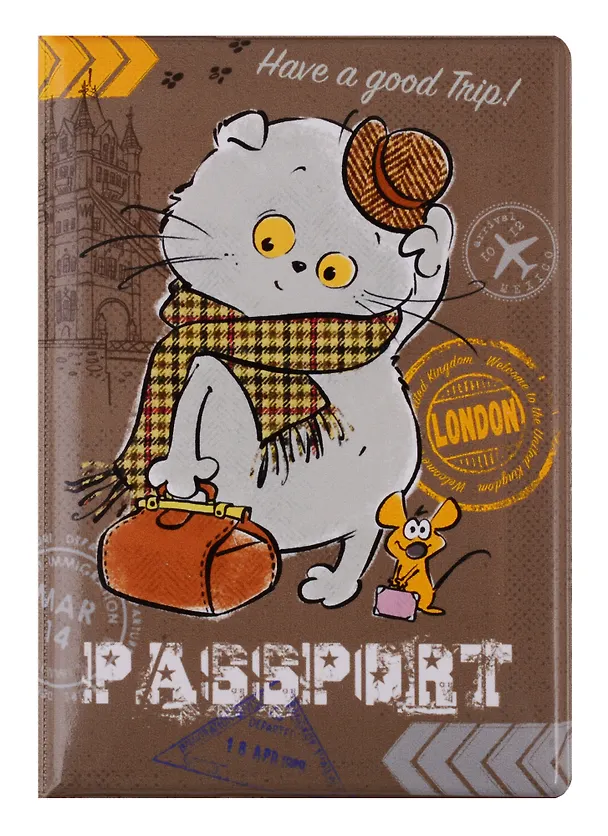 Хорошая, красивая, качественная обложка для паспорта с забавным котом и мышонком. Обложка немного пухлая, средней жёсткости, идеально подходит для паспорта - ни больше ни меньше. За длительное время эксплуатации ничего не расклеилось. Единственный момент - зимой, в сильный мороз она застывает (даже в сумке), лучше её немного отогреть если необходимо предъявить документ на входе, чтобы не лопнула.