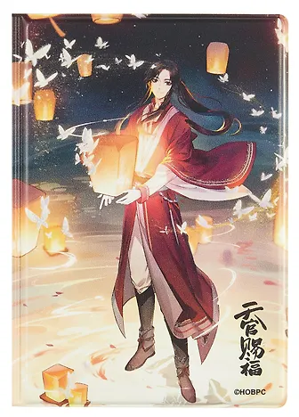 Очень красивая и плотная обложка, надежная, стойкая к намоканию. На обложке изображен любимый персонаж из новеллы "Благословение небожителей", картинка очень красивая, яркая и четкая, украшена учасками с блеском, что делает ее еще более живой и интересной.