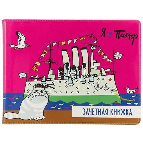 Обложка на зачётную книжку будет вселять в вас позитив каждую сессию. Ещё бы, ведь она такая яркая и необычная! На ней нарисован крейсер «Аврора» и пушистый кот-моряк.