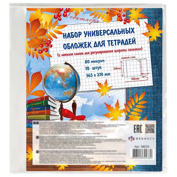 Обложки для учебников,тетрадей и дневников, 10шт.,365х210мм 80мк с липким слоем, Феникс+