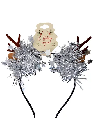 Ободок новогодний в виде рожек оленёнка с ушками и мишурой сразу создаёт праздничное настроение — достаточно лишь надеть его, и образ становится по‑настоящему зимним и сказочным. Мягкий текстиль приятно прилегает к голове и не давит, поэтому аксессуар комфортно носить на утреннике, корпоративе, домашней вечеринке или во время зимней фотосессии.