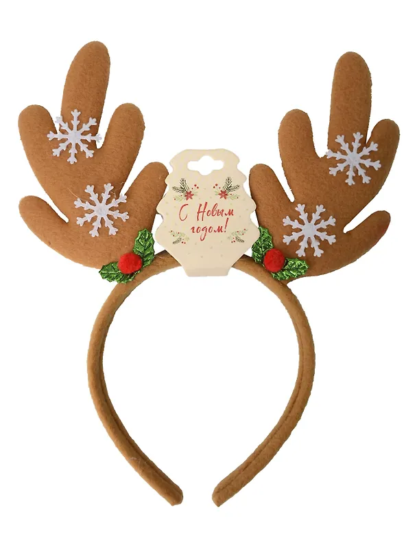 Ободок в виде рожек оленёнка со снежинками из текстиля — простой способ мгновенно создать праздничное настроение. Мягкий материал удобно сидит на голове, не давит и подойдёт как взрослым, так и детям на утренник, корпоратив или домашнюю фотосессию у ёлки. Коричневые рожки с аккуратным декором смотрятся забавно, но не вычурно, легко сочетаются с любым новогодним костюмом или повседневной одеждой.