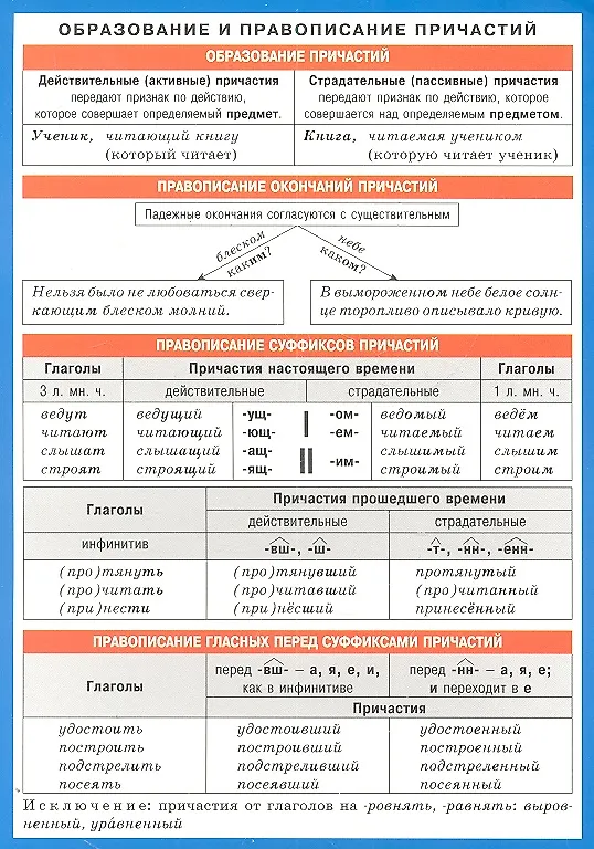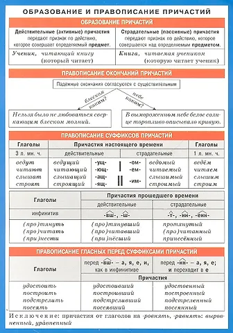 Наибольшие трудности в русском языке вызывают орфография и пунктуация. Правила забываются, грамотность школьников резко понижается. Самостоятельно поправить положение возможно, работая по данному наглядному пособию. Можно не только вспомнить, но и закрепить правила. А проверить свою грамотность, можно написав сочинение или диктант, периодически обращаясь к наглядной табличке. Лицевая сторона наглядного пособия посвящена "Образованию и правописанию причастий". Справочное пособие имеет удобный формат, уже знакомый ранее школьникам по предыдущим выпускам наглядных пособий по русскому языку издательством "Айрис"; ёмкость материала способствует чёткому запоминанию правил, преодолению трудностей и