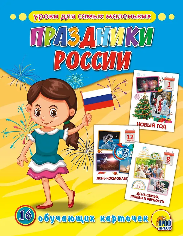 Набор обучающих карточек «Праздники России» познакомит ребёнка с основными календарными праздниками нашей страны и их символами. Благодаря данному набору ребёнок узнает, когда в России празднуют Новый год, Рождество Христово, День защитника отечества, День космонавтики, День победы и многие другие праздники. Карточки яркие, красочные, рассматривать их одно удовольствие!