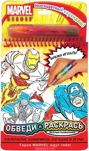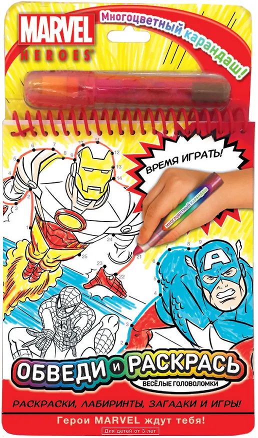 Раскраска об удивительных приключениях Человека-Паука и других героев Marvel, а также многоцветный карандаш в подарок.