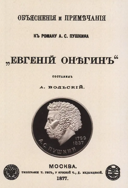 Репинт с издания. Москва, 1877. Непосредственное понимание текста "Евгения Онегина" было утрачено уже во второй половине XIX века. …В Евгении Онегине более, чем в каком другом произведении, мы встречаем массу непонятных для нас выражений, намеков… В книге подробно разобрана терминология 1-6 глав (на том издание прервалось в связи со смертью автора) и объяснены особенности быта онегинской эпохи.