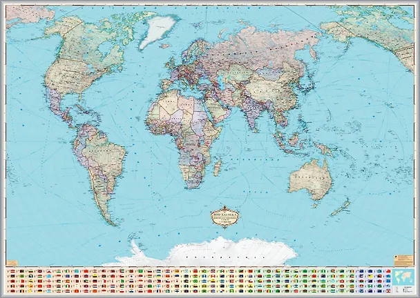 Отличная красочная карта мира с политическим устройствоа государств. Плотный картон, ламинация. Отпечатана в Германии на соверменном оборудовании. На карте нанесены все государственные границы, города, столицы, жд и автодороги. Также на карте присутствует блок "Флаги государств" с информацией о населении, площади, телефонными кодами стран мира.