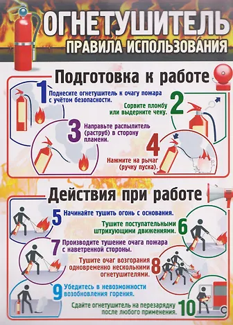Плакат "ОГНЕТУШИТЕЛЬ. ПРАВИЛА ИСПОЛЬЗОВАНИЯ" представляет собой иллюстрированное руководство по использованию огнетушителя для нейтрализации очага возгорания. Плакат рекомендован для размещения на предприятиях, в офисных помещениях, в местах публичного пользования и везде, где имеются огнетушители.