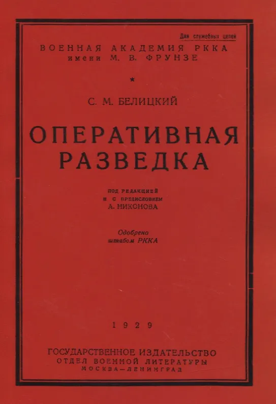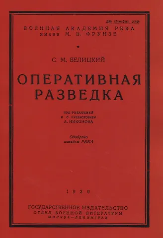Белицкий С. Л. — «Оперативная разведка». Труд С. М. Белицкого посвящен мало исследованному в нашей военной литературе вопросу оперативной разведки. В этой работе автор знакомит читателя с общей системой разведывательной службы в современных условиях. Дает сжатую, но яркую и исчерпывающую характеристику главнейших средств и ресурсов разведки современных армий и устанавливает основы организации различных разведывательных органов и их взаимоотношений с общевойсковым командованием и пр. Книга предназначена для высшего и старшего начсостава и слушателей III курса Военной академии РККА.