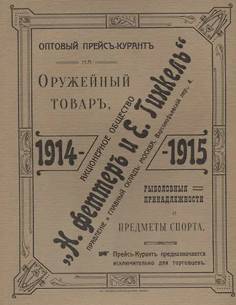 Оптовый прейсъ-курантъ на оружейный товаръ, рыболовныя принадлежности и предметы спорта. Акционерное общество Н.Феттеръ и Е.Гинкель. 1914-1915 г. Репринтное издание