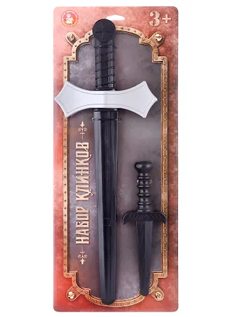 Сражение на мечах – одна из любимых игр всех мальчишек, ведь в ней они могут представить себя прекрасными средневековыми рыцарями в блестящих доспехах. Чёрный пластиковый меч с серебряной гардой и чёрный пластиковый кинжал станут прекрасным оружием для подобных схваток!