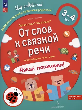 Полный курс игровых занятий по развитию речи для детей 3-4 лет. Комплект тетрадей "Давай поговорим!" разработан специально для программы дошкольного образования "Мир открытий". С. Батяева и Е. Мохирева - практикующие логопеды. Их тетради - это результат каждодневной работы с детьми, поэтому в них мало скуки, а много игры, интересных идей и заданий, фантазии. Комплект рассчитан на целый год занятий с малышами 3-4 лет. Тетради соответствуют требованиям ФГОС дошкольного образования, заниматься по ним можно как в детском саду, так и дома. В тетрадях можно и нужно рисовать, раскрашивать, приклеивать наклейки, что всегда нравится детям 3-4 лет. Но самое главное - все задания легко превращаются в н