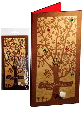 Оригинальная поздравительная открытка ручной работы, выполненная из дерева, станет теплым и исключительно уместным приложением к любому подарку.