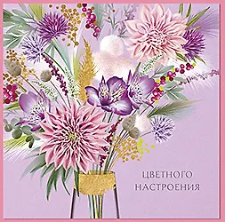 Размеры: 150 x 150 мм Адресат: без адресата Повод: без повода Отделка: Фольга, выборочный УФ-лак. Упаковка: Крафтовый конверт. Индивидуальная упаковка в пакет. На открытке: Цветочного настроения Внутри: Возьми немного красок счастья, добавь к ним нежный тон добра, почувствуй сердцем: жизнь прекрасна, ещё прекрасней, чем вчера!