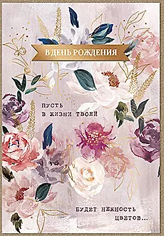 Размеры: 137 x 200 мм Адресат: без адресата Повод: день рождения Отделка: Фольга, выборочный УФ-лак. Упаковка: Крафтовый конверт. Индивидуальная упаковка в пакет. На открытке: Пусть в жизни твоей будет нежность цветов... Внутри: Свет и сиянье особенных слов, прекрасные люди, хорошие дни, радость на сердце и сердце в любви!