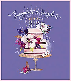 Размеры: 139 x 159 мм Адресат: без адресата Повод: день рождения Отделка: Фольга, выборочный УФ-лак. Упаковка: Белый конверт. Индивидуальная упаковка в пакет. На открытке: Загадывай и задувай Внутри: Слой удачи, крем везенья И бисквит из вдохновенья Корж подарков и сюрпризов С пудрой сахарных капризов- все исполнит в одночасье вкусный торт большого счастья!