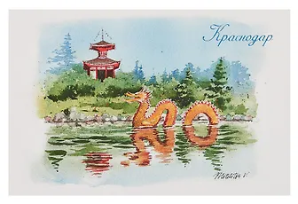 Очень интересная, яркая, сочная подарочная открытка! Дракон по центру просто невероятный. Действительно отличающаяся от многих открытка, ведь на ней изображен японский сад, крутая достопримечательность Краснодара, то, за что он стал известен также. Очень живописное место, эстетику которого удалось передать на данном рисунке. Однозначное советую к покупке