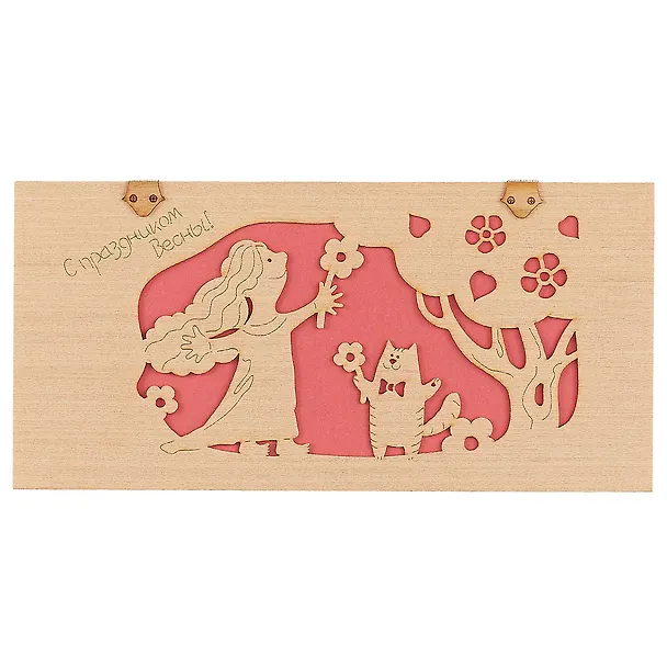 Открытка сделана из шпона дерева и бумаги, на которой вы можете сами написать поздравление.
