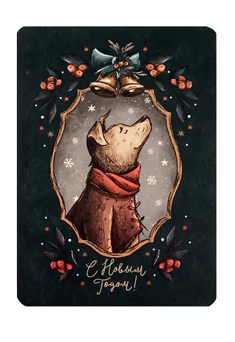Не дожидаясь новогоднего праздника, приобрела в магазине "Читай-город" эту чудесную открытку. В ней интересно все: и необычный сюжет (милый пёсик в рамке рождественского веночка и на фоне падающих снежинок), и приятное матовое покрытие, и приглушенное цветовое решение, как на ретро открытках, и форма со скругленными уголками, что тоже привносит налет старины.