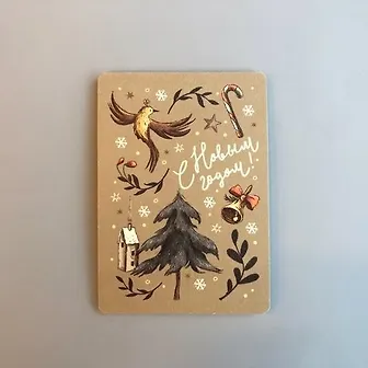 Замечательная новогодняя открытка. Выполнена из плотного картона приятного бежевого цвета. С красивой праздничной иллюстрацией. Открытка одинарная, с обратной стороны предусмотрено место для поздравления. Поверность глянцевая, так что нужно давать чернилам время для высыхания, чтобы надпись не размазалась. Я всегда дополняю новогодние подарки для родных и друзей тематическими открытками.