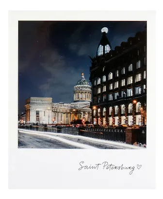 Невероятно красивая открытка с изображением Казанского собора и книжного магазина "Зингер". Открытка в виде полароидного снимка, на плотном материале. Фотография выполнена в ночное время. Снимок чёткий, с насыщенными цветами. Отлично передает атмосферу Санкт-Петербурга. Можно подарить друзьям, повесить на гирлянду дома или использовать как закладку для книжки (а почему бы и нет).