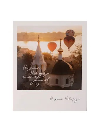 Небольшая уютная открытка в стиле "полароид". Качественная, отпечатана на плотной бумаге, глянцевая. Привлекла моё внимание завораживающей фотографией заката в Нижнем Новгороде: запечатлен редкий момент-пейзаж с воздушными шарами. Приятная теплая цветовая гамма.