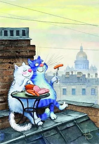 Романтический колбасный ужин на крышах Санкт-Петербурга с любимым синим котиком! О чём ещё может мечтать любая кошечка?! Здесь перед нами, т.е. перед ними, открывается шикарный вид на город, на Исаакиевский собор в частности. Кошечка очень довольна))) А синий петербургский кот о чём-то вспомнил и тоже рад такому вечеру. Чтобы вспоминать о своей поездке в Санкт-Петербург, обязательно нужно приобрести такую открытку в качестве сувенира! Также это прекрасный экземпляр в коллекцию)