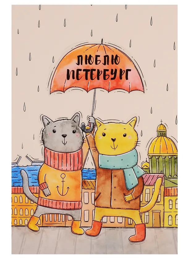 Открытка одинарная с конвертом СПб "Люблю Петербург. Коты под зонтом"