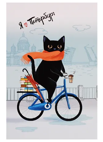 Открытка одинарная с конвертом "Я люблю Петербург. Котик на велосипеде"