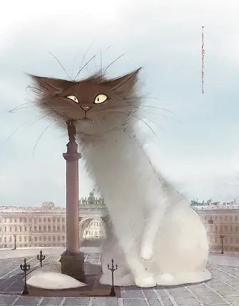 У открытки нереально милый вайб. Во-первых, сам стиль рисовки очень мимимишный, во-вторых, сам котик очень классно вписан в одну из улиц Санкт-Петербурга.