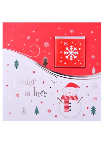 Открытка с шоколадом Winter is here Снеговик с шарфом (красно-белая), 5г