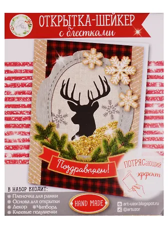 Открытка-шейкер — это дополнение к новогоднему подарку! Она имеет прозрачное окно, куда засыпаются блёстки. При встряхивании декор красиво переливается. В набор входят: основы для открытки; плёночка для рамки; чипборд; декор; клеевые подушечки. Этапы работы: Согните основу по линии биговки. Выдавите фигурки. Высыпьте декор из пакетика в прозрачную формочку. Закрепите её на основе с помощью двусторонней клейкой ленты. Украсьте картонными элементами. Ваш шедевр готов!