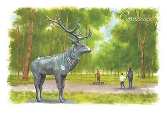 Открытка «Смоленск. Сад Блонье. Олень», акварель, автор Т. Покровская.