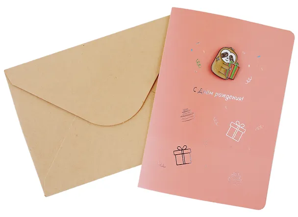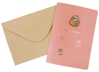 Открытка с которой он в комплекте очень красивая, необычного насыщенного цвета, оформлена в неброском стиле, с маленькими рисунками снаружи и внутри. В ней достаточно места для поздравления. В открытке есть отверстие, в которое вставлен значок. Держит значок мягкая резиновая насадка, черного цвета. Хорошо, крепко держит, игла закрыта, а эта застежка не царапает кожу, если носить значок летом на тонкой ткани. Да и она плотнее прилегает.