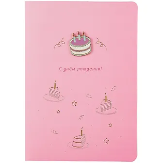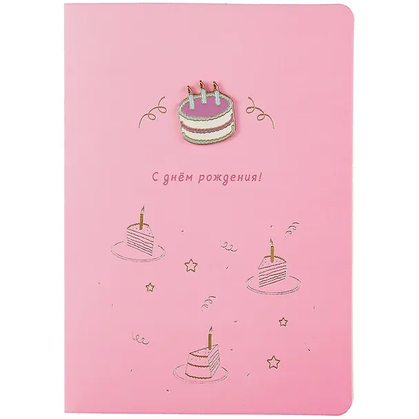 На открытке есть отверстие, в которое вставлен этот милый маленький значок в виде именинного пирога со свечками. Очень необычный значок, которым можно украсить свою одежду и все поймут, что у вас праздник. Цвета у значка не слишком яркие, свечки и края торта голубоватые, а верх и средняя полоска ягодного цвета с фиолетовым оттенком. Основной цвет белый. Линии рисунка золотистые.
