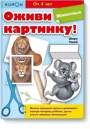 Этот сборник заданий помогает развивать навыки по методике индивидуального обучения KUMON в разделе "Вырезать и клеить". Серия тетрадей "Оживи картинку!" направлена на развитие мелкой моторики. Ребенку предстоит вырезать детали разной формы и приклеивать их на картинки. С готовыми аппликациями можно играть! Например, стоит подвигать деталью и бегемот откроет рот, а павлин распустит свой великолепный хвост. Интерактивные задания помогут вовлечь ребенка в процесс занятий! Тетрадь подойдет для детей, которые уже освоили работу с ножницами, научились складывать бумагу, а также освоили работу с клеем.