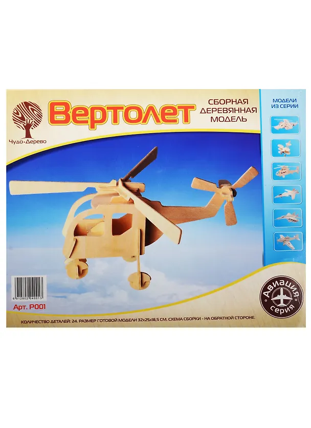 P001 Сборная деревянная модель Вертолет (24 детали) (32х25х18,5см) (Авиация) (Чудо-дерево) (3+) (упаковка)