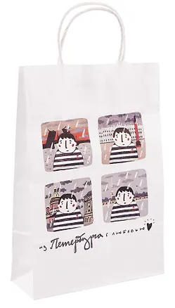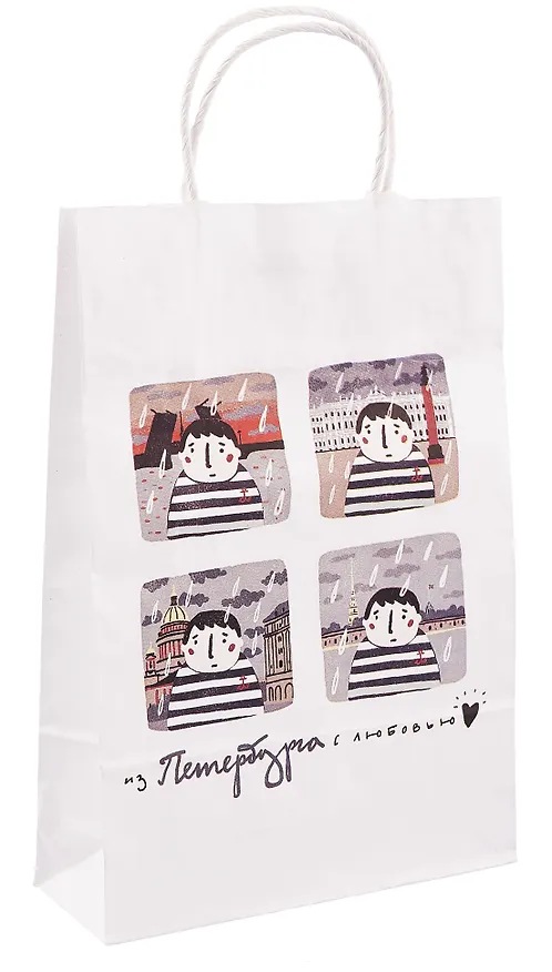 Бумажный пакет с изображением мальчика и петербургского дождя.