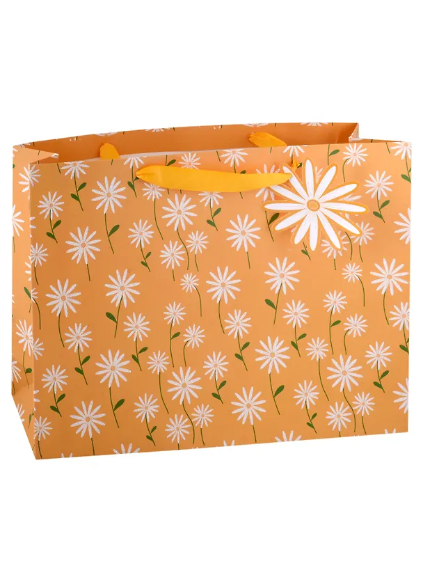 Очень красивый подарочный пакет! Во-первых, он хорошего размера. То есть коробка конфет, а также что-то основное поместится сто процентов. А во-вторых, это очень красивый и яркий летний дизайн с цветами. Мне попался оранжевый с ромашками, в жизни он выглядит даже лучше, чем на картинке. Сделан из плотного материала, ручки крепкие и не порвутся. Всё в идеальном виде