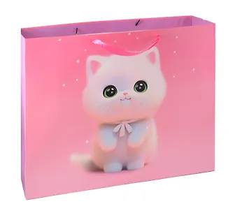 В пакет упаковали ребенку подарок на восьмое марта. Пакет понравился ребенку больше, чем сам подарок. Цвет пакета насыщенно розовый, рисунок котик очень симпатичный. Пакет по объему большой, но не широкий, при покупке имейте это ввиду. Мне показалось, что ручки у пакета слишком тонкие, тяжелое могут не выдержать. Дно пакета проложено, склеен не плохо, но в одном месте были видны следы клея.