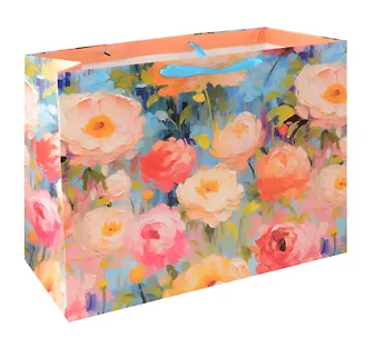 Яркий и очень праздничный упаковочный пакет. Смотрится пакет сам как подарок. Женщине или девушке для упаковки подарка будет отличным вариантом. Размер пакета большой, а вот по ширине пакет совсем не большой. Ручки из ленточки, удлиненные, завязаны на узелок, поэтому их можно с легкостью укоротить при необходимости. Склеен вроде надежно, качество бумаги не плохое.