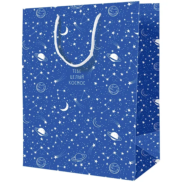 Очень красивый и эстетичный пакет с планетами. Я люблю тематику космоса в таких вот вещах, поэтому мне очень понравилась картинка. Приятный фиолетовый цвет, он в жизни тоже такой же яркий, как и на картинке. Про сам пакет могу сказать, что он сделан хорошо, у него нормальный размер, так что поместится всё, что я хочу подарить
